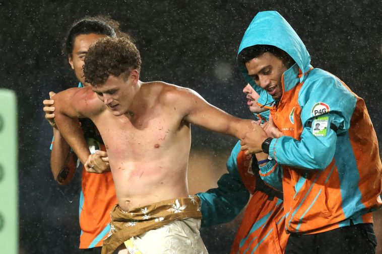 This pitch invader shows impressive determination to escape the tackle of the first responder during the Blues-Chiefs clash at Eden Park, but can’t beat the calvary!